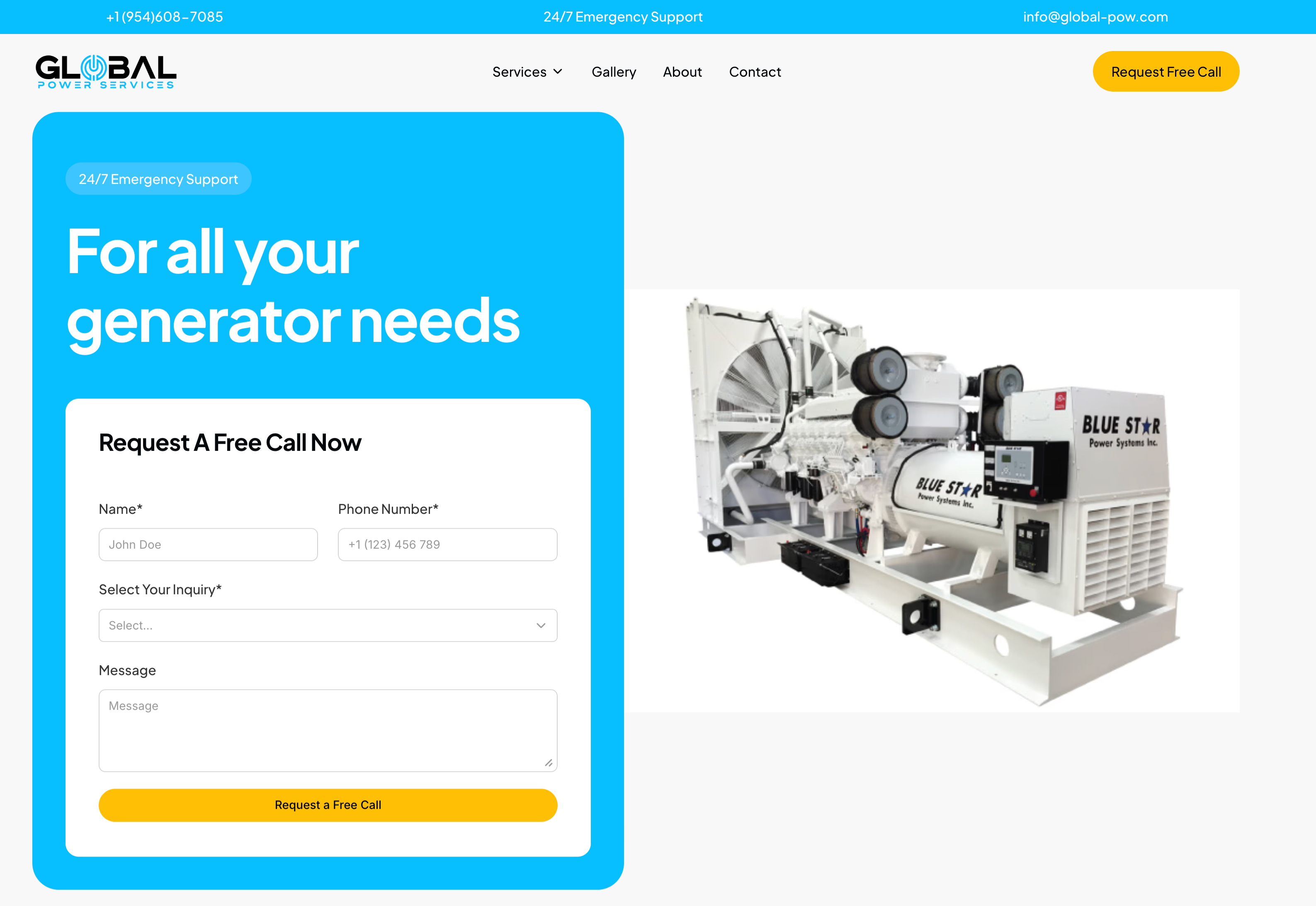 A website for a generator specialist showcasing their products, maintenance services, and commitment to reliable power solutions.
