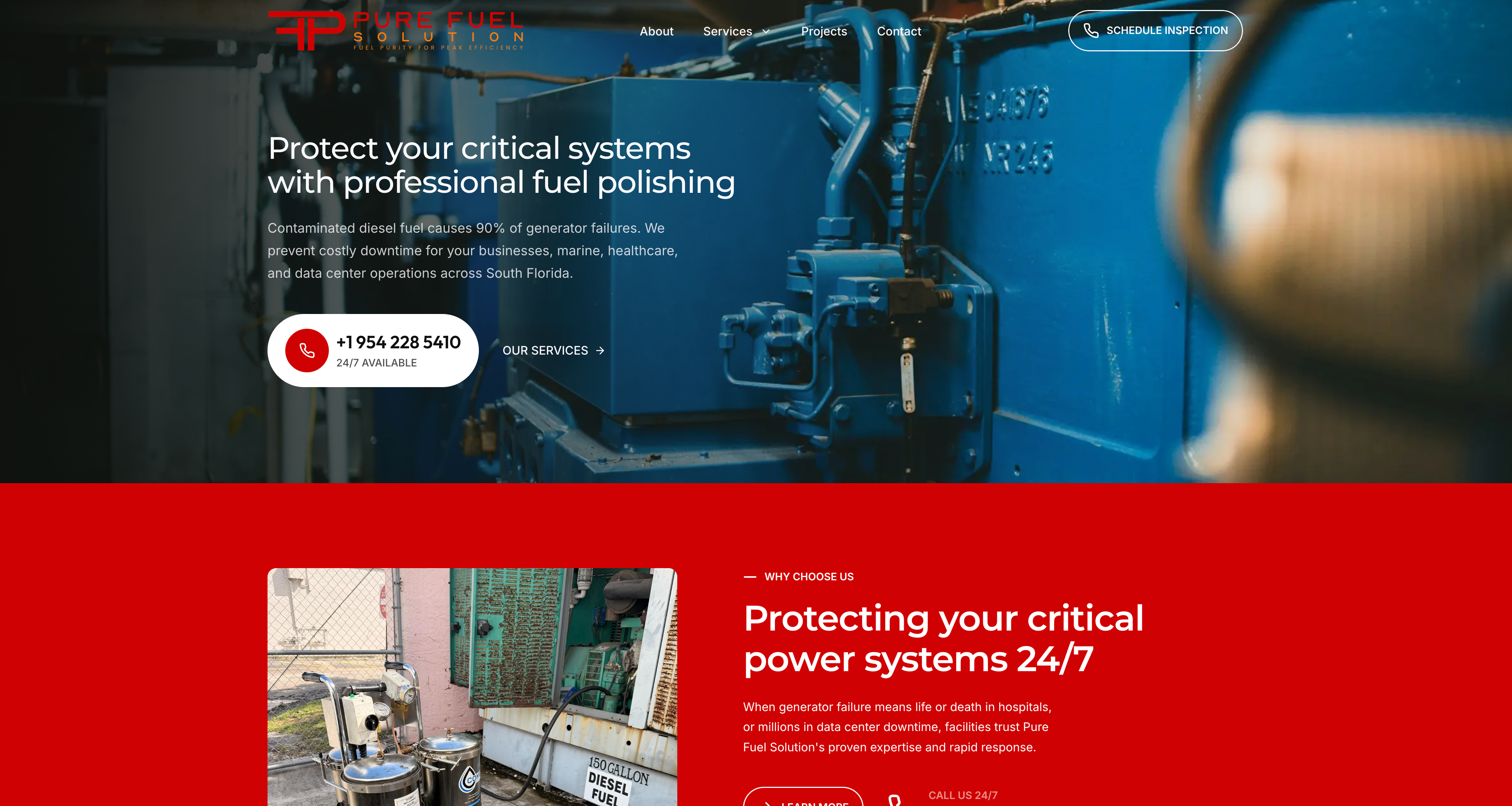 A website for a 24/7 diesel fuel polishing service protecting critical infrastructure across South Florida.